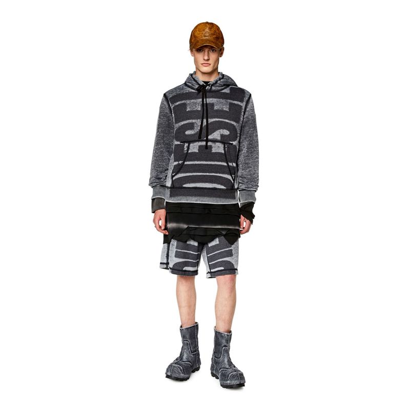 Sudadera con capucha de fit regular para hombre confeccionada en mezcla de algodón con forro de bouclé. Este modelo presenta un tratamiento burnout para lograr que la palabra Diesel en grande tenga un tono más oscuro. • Composición: 65%Poliéster 35%Algodón, Elástico 65%Poliéster 33%Algodón 2%Elastano • País Origen: India • El modelo viste una talla L y mide 182 cm