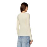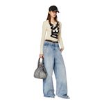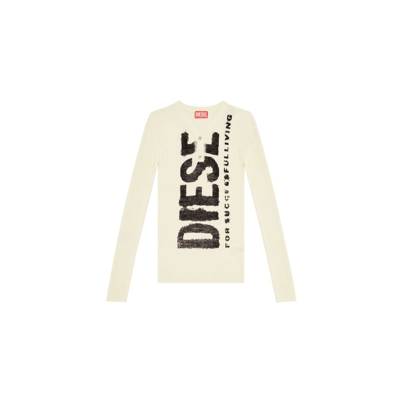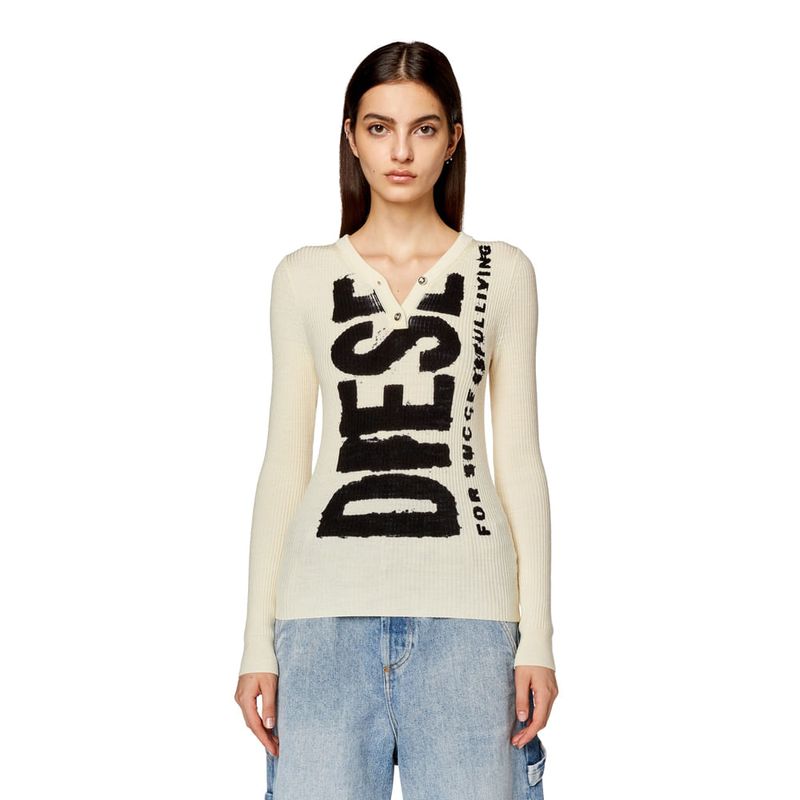 Jersey para mujer con cuello en V abotonado y corte entallado. Confeccionado en lana de origen responsable, este tejido en canalé se ha estampado especialmente en el interior para crear efectos irregulares con manchas de color y llega el logotipo en el centro. • Composición: 100%Lana • País Origen: China • La modelo viste una talla S y mide 175 cm