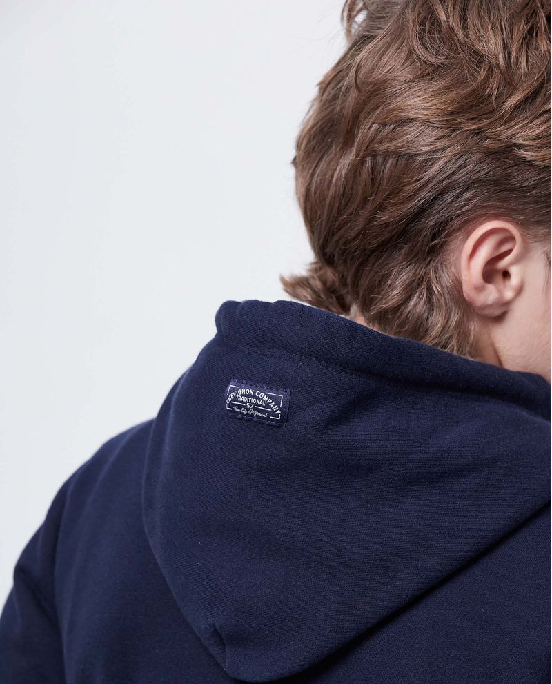 • Cuello con capucha ajustable, puños y fajón en tejido rib, y bolsillo canguro.
