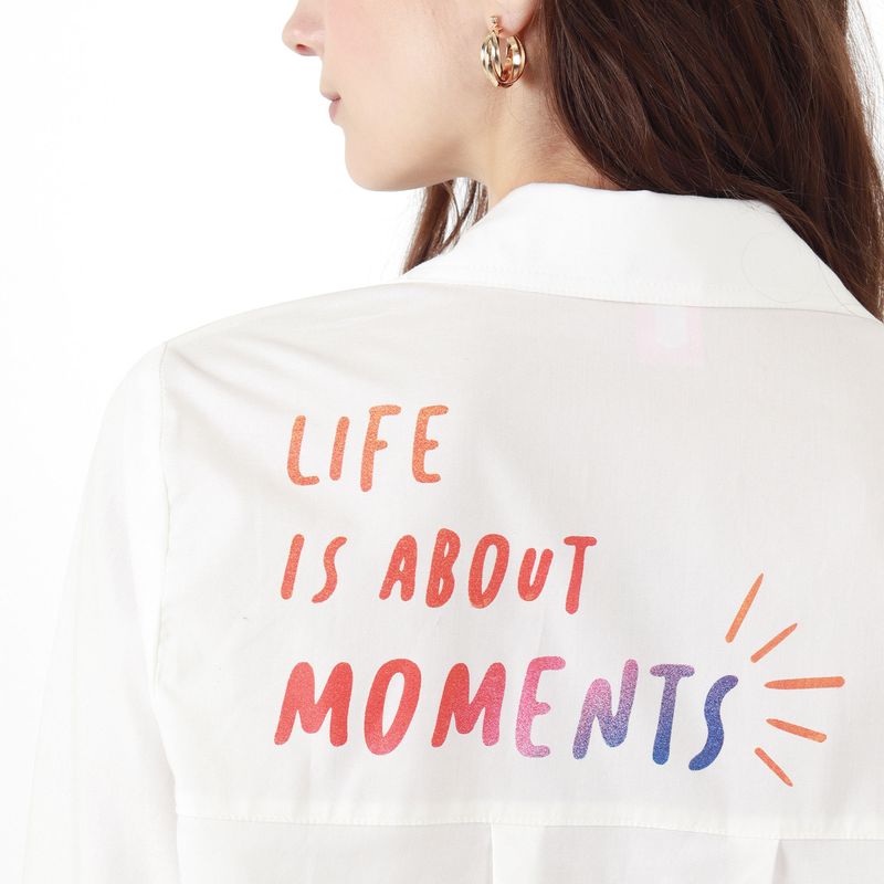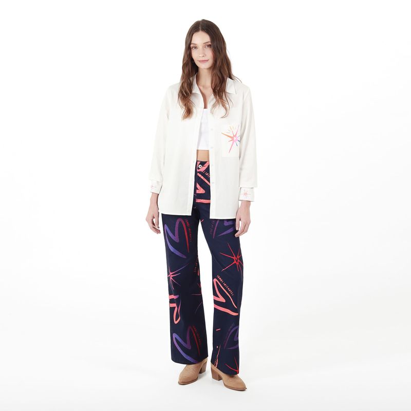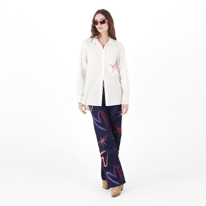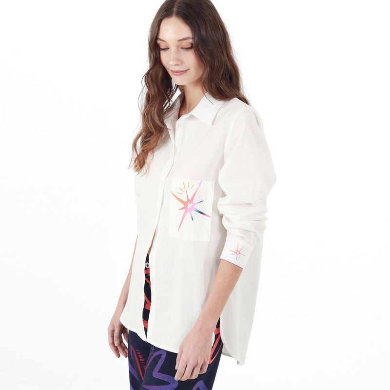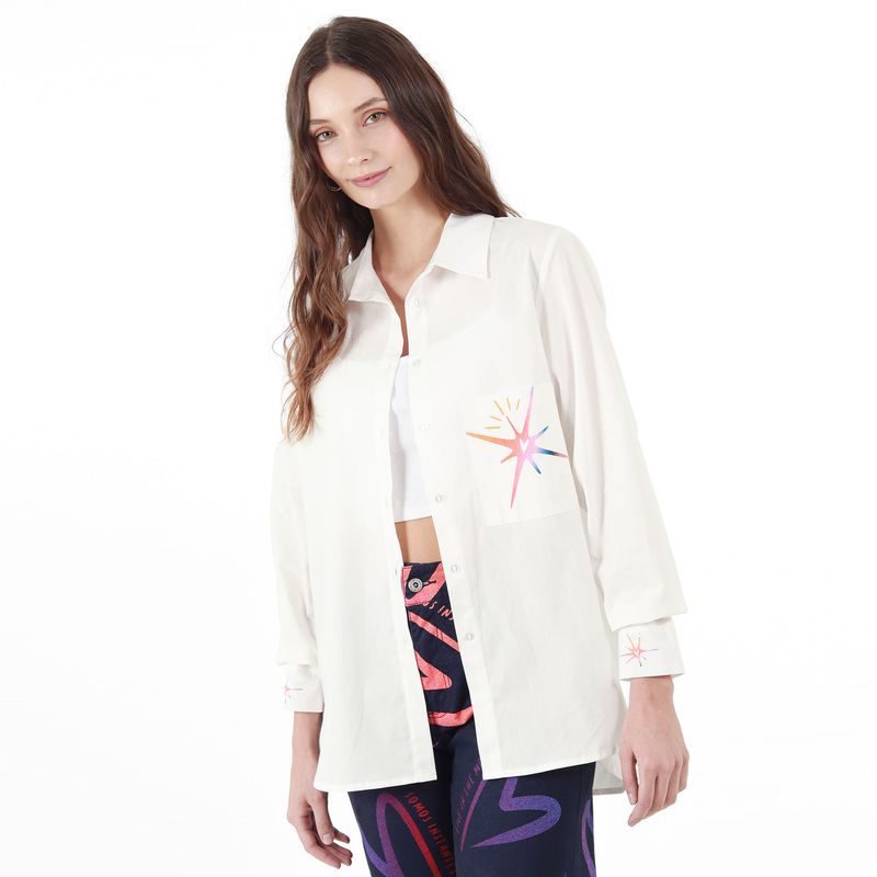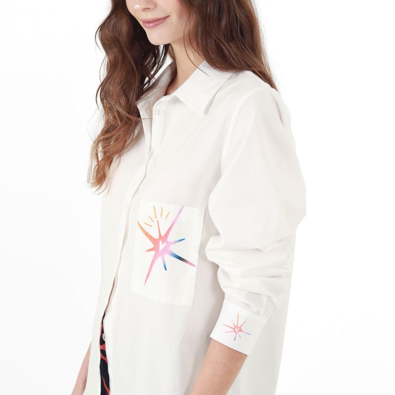 CAMISA MANGA LARGA CON BOTON EN PUNO CUELLO CAMISERO CON BOTONES EN PECHERA BOLSILLOS DE PARCHE Y PRENSES EN ESPALDA Y MANGA CON ESTAMPADO LOCALIZADO EN DELANTERO BOLSILLOS PUNOS Y ESPALDA