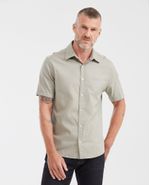 • Manga corta, cuello camisero y perilla completa de botones.