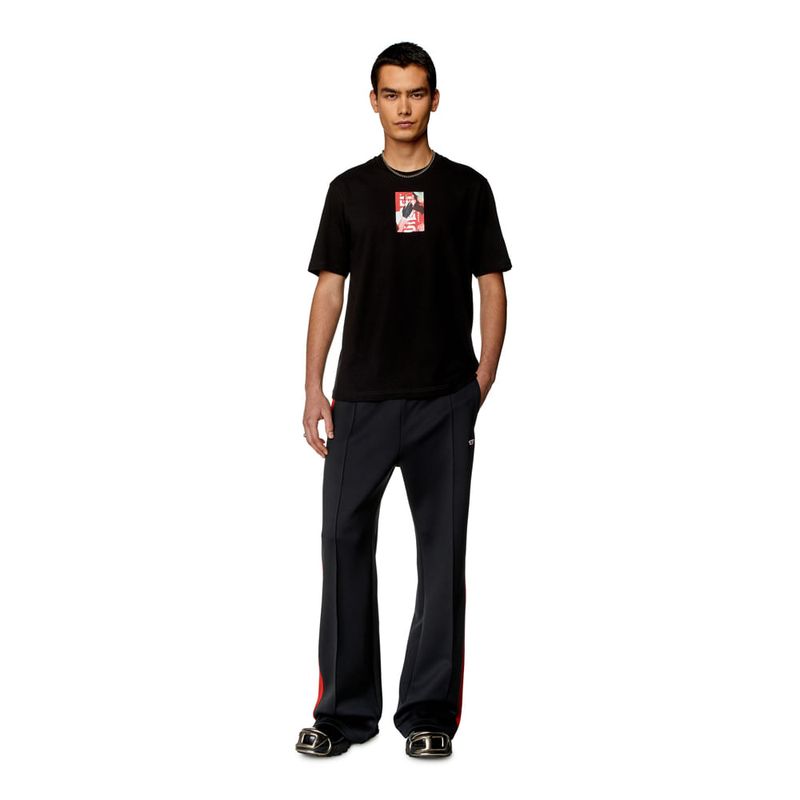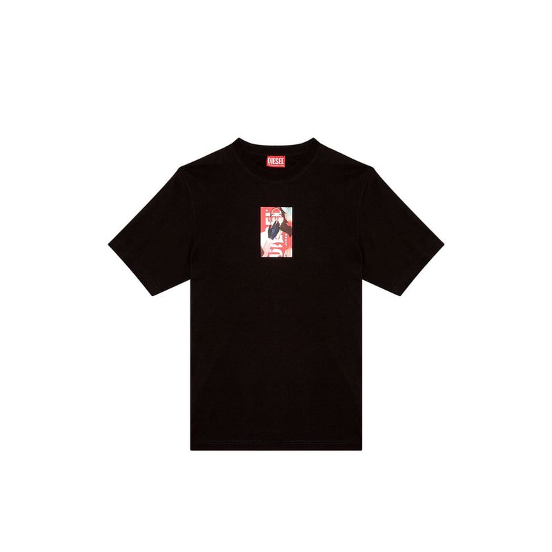 Esta camiseta para hombre está hecha de tejido de algodón que, debido a la naturaleza del hilo, tiene una textura ligeramente 'cruda' y un aspecto icónico. Tiene fit regular y está adornada con un gráfico distorsionado que combina un estampado fotográfico y el icónico logotipo rojo de Diesel; se usa el mismo logotipo como adorno pequeño en la parte trasera.