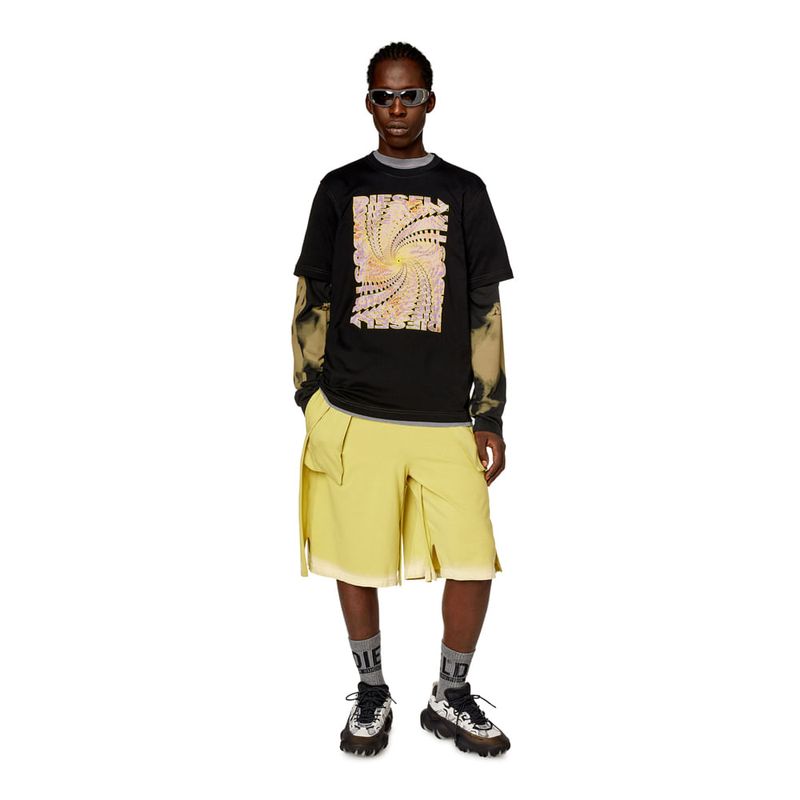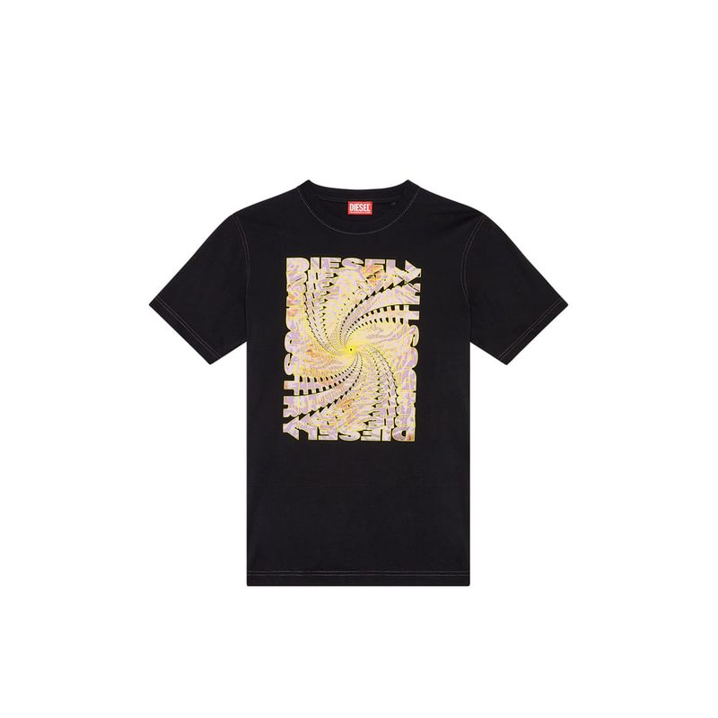 Camiseta Manga Corta Para Hombre T-Just-N12 Diesel. Esta camiseta para hombre combina la ilusión óptica con un patrón de camuflaje a rayas inspirado en las cebras, a través de un original estampado gráfico de un túnel en espiral con la frase 'Diesel Industry'. Está hecha de tejido de algodón orgánico y tiene un fit regular. • Composición: 100%Algodón • País Origen: La India • El modelo viste una talla L y mide 182 cm