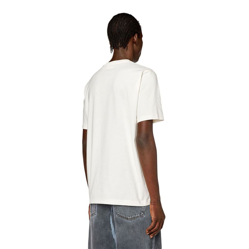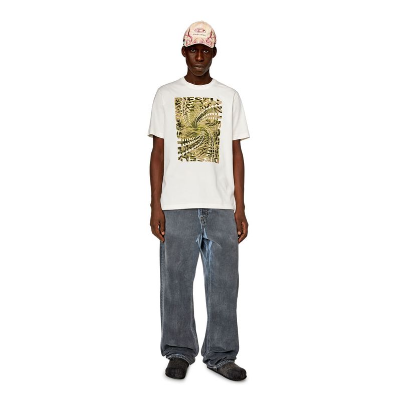 Camiseta Manga Corta Para Hombre T-Just-N12 Diesel. Esta camiseta para hombre combina la ilusión óptica con un patrón de camuflaje a rayas inspirado en las cebras, a través de un original estampado gráfico de un túnel en espiral con la frase 'Diesel Industry'. Está hecha de tejido de algodón orgánico y tiene un fit regular. • Composición: 100%Algodón • País Origen: La India • El modelo viste una talla L y mide 182 cm