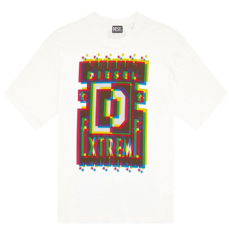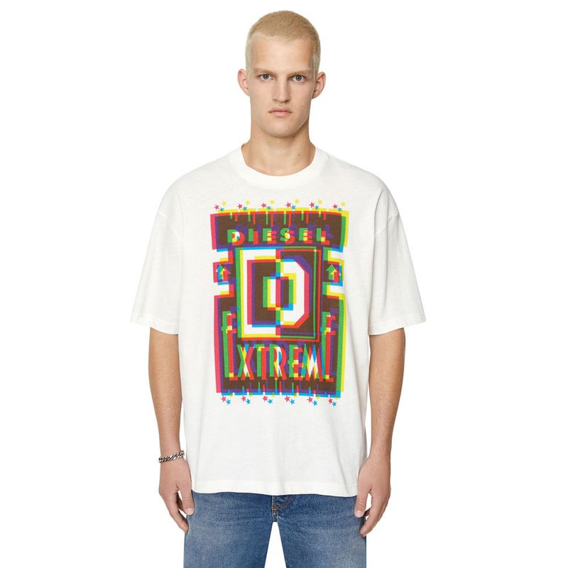 Diesel es una innovadora marca internacional de estilo de vida que produce una amplia colección de jeans, ropa y accesorios. Somos pioneros en denim y con el pasar de los años nos convertimos en una marca de ropa casual premium, siendo una verdadera alternativa en el mercado de lujo establecido. Somos una marca que representa la pasión, la individualidad y la autoexpresión. El Mundo DIESEL te espera. Esta camiseta para hombre presenta un gráfico tricolor del logotipo estampado con un efecto tridimensional estereoscópico. Hecha de algodón y de aspecto crudo, tiene forma extragrande y un parche 'X55’ en jacquard en la nuca. 100%Algodón País Origen: China El modelo viste una talla L y mide 182 cm