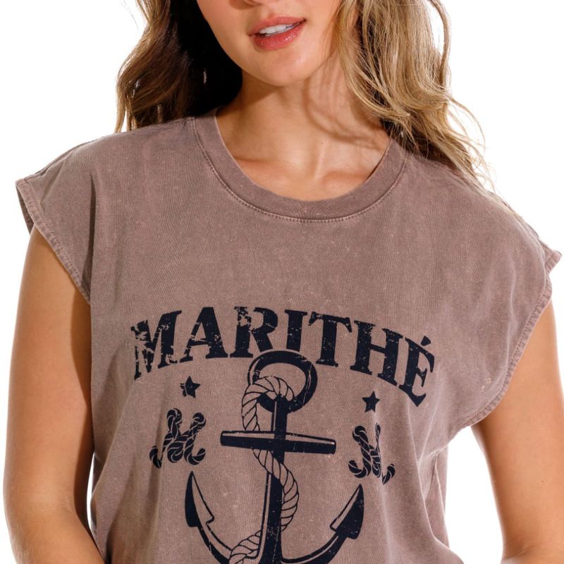 Camiseta con cuello redondo en rib y manga sisa. Confeccionado en 100% algodón de 180 gr.Efecto lavado. Estampado en frente.