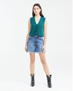 Esta camiseta tipo chaleco con escote en V y detalles de jaladeras, elaborado en mezcla de poliéster, rayón y elastano, simula una textura tejida con hilos metalizados que añaden un sutil brillo. Perfecta para combinar con pantalones y zapatos altos para una ocasión de noche o con shorts y sandalias para un look veraniego relajado.