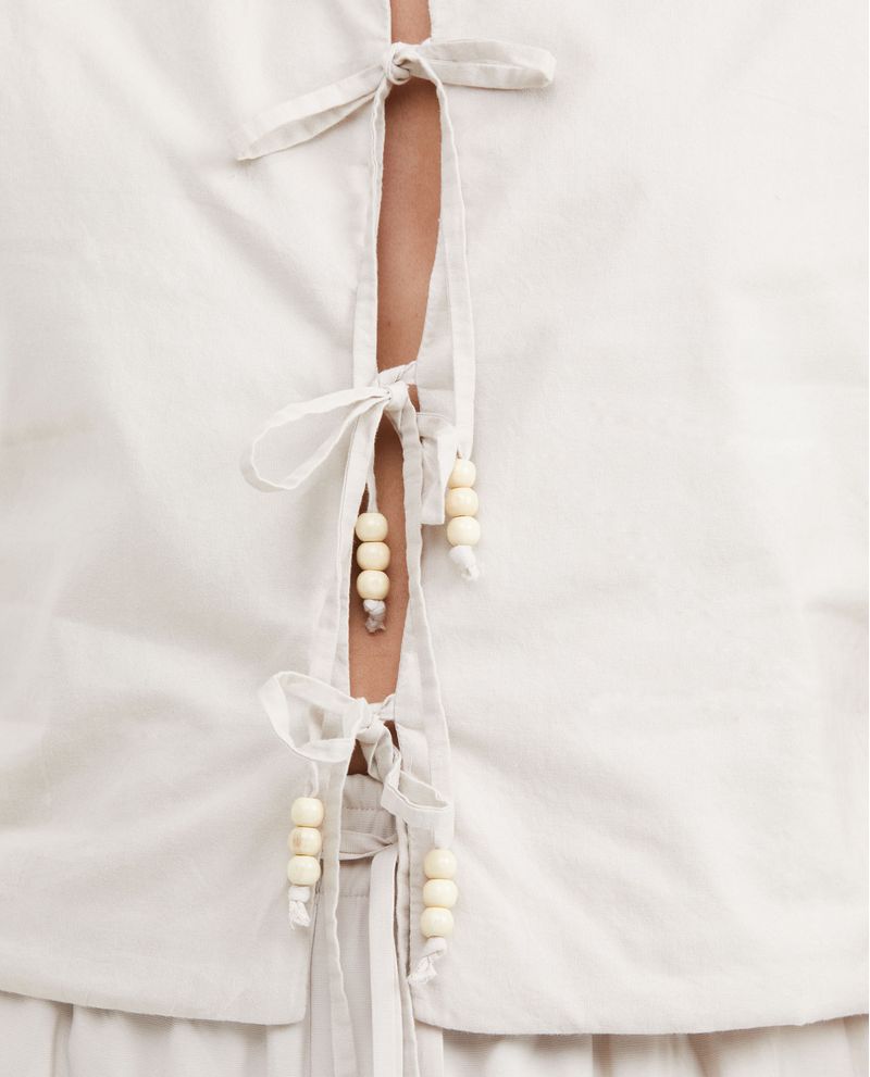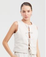 • Diseño con cuello redondo alto, manga sisa y amarres frontales con cordones en tela principal rematados con cuencas de madera.