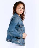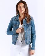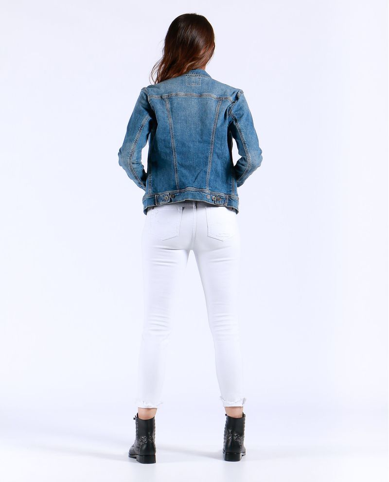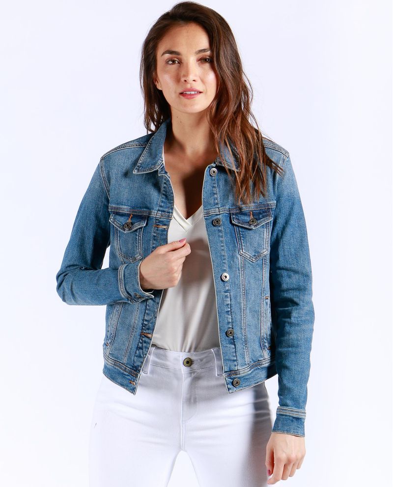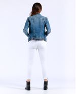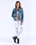 Chaqueta de mujer en denim, con perilla completa de botones. Tono medio claro, con iluminaciones. Bolsillos de parche con tapa y botón en el frente, bolsillos de ribete en los costados y charreteras en la pretina trasera. El detalle de iluminaciones sutiles le da un efecto naturalmente desgastado a esta trucker jacket tradicional.