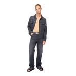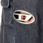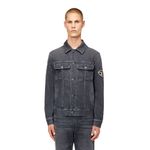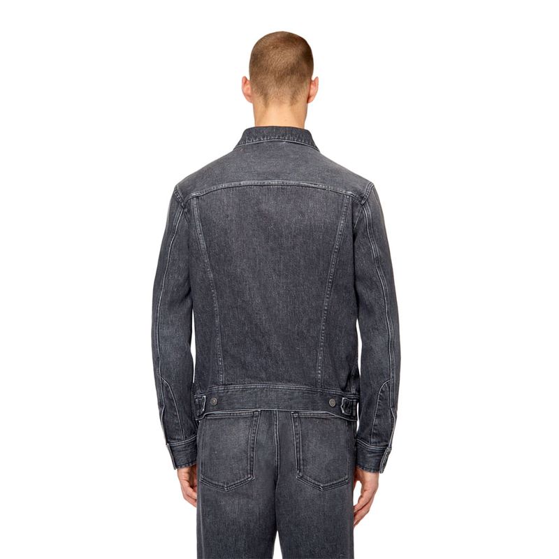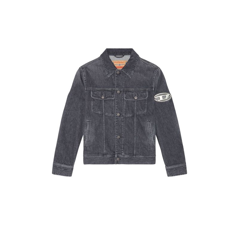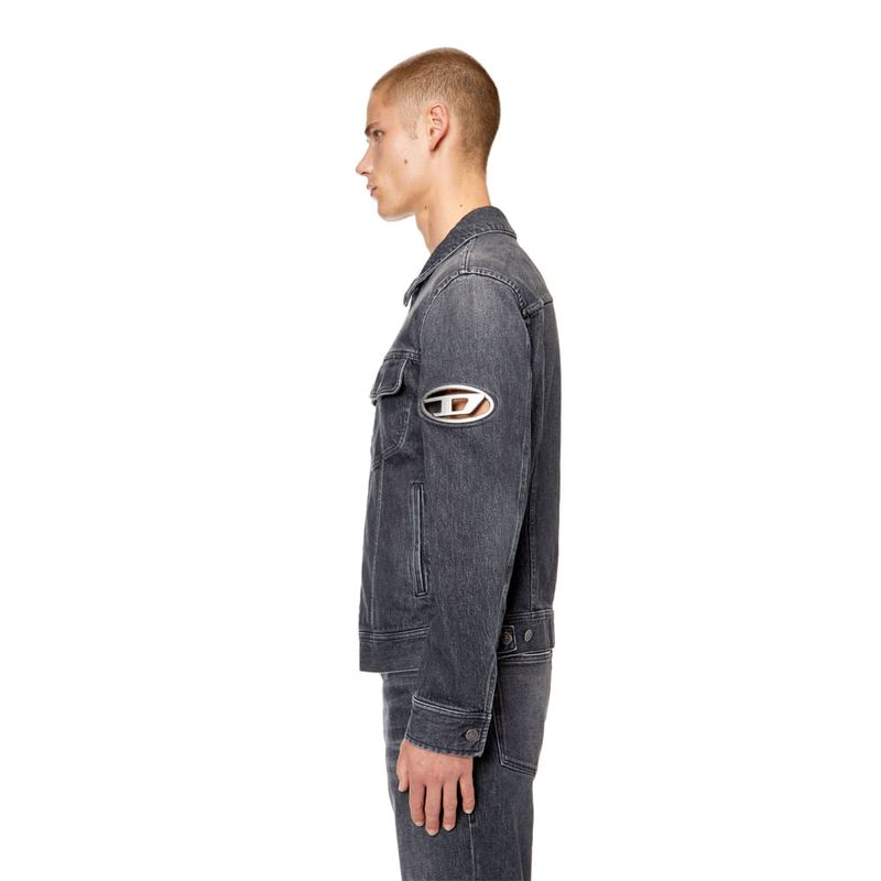 Chaqueta de denim para hombre de la colección spring summer 2023 runway show. diseñado para un fit regular, este modelo trucker exclusivo reimagina el logotipo oval d de Diesel como una placa de metal plateado envejecido; el adorno llamativo crea una inesperada ventana en la manga con la piel al descubierto. El modelo viste una talla l y mide 182 cm