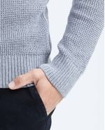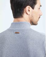 • Propuesta que combina diferentes tipos de puntadas: tejido perlado con fibras jaspeadas en el cuerpo y las mangas, tejido jersey en detalles de los hombros, pieza del cierre y bolsillo, y tejido acanalado en cuello, puños y fajón.