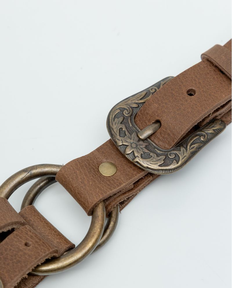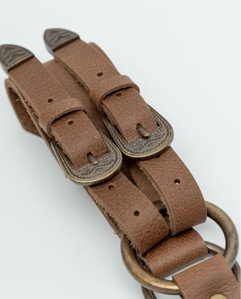 • Compuesto por 3 hebillas tipo western, una de tamaño mediano y 2 más pequeñas, unidas por una argolla central.
