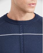 • Propuesta que combina diferentes tipos de tejidos y puntadas: tejido jersey y tejido de trenzas en el cuerpo y las mangas, y tejido acanalado en el cuello, los puños y el fajón.