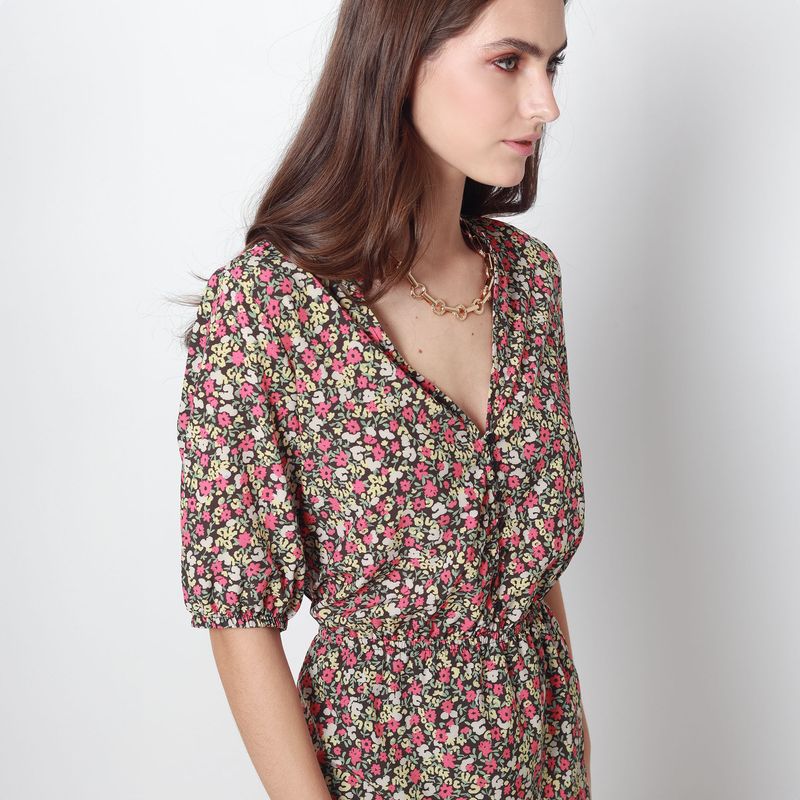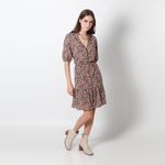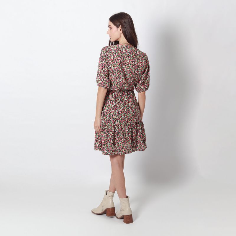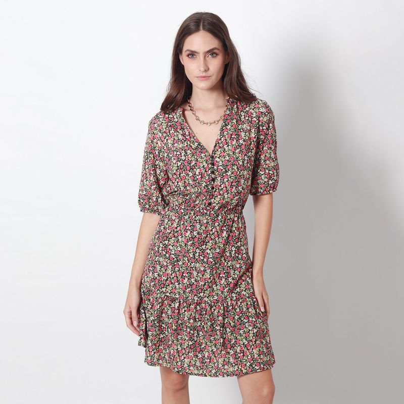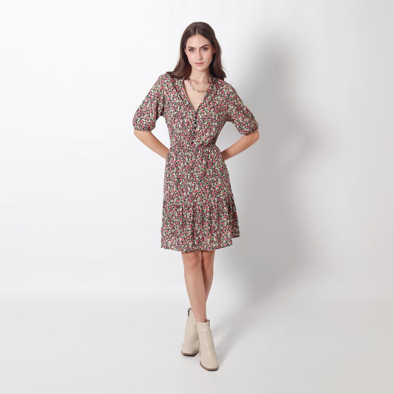 VESTIDO ESCOTE EN V MANGA CORTA CON ELASTICO EN PUNO BOTONES EN DELANTERO Y CORTES EN FALDA
